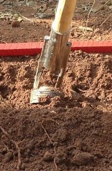 Deminers must remember that the length prodded is NOT the distance ahead of the excavation face that can be safely removed with a trowel. The picture above shows a prodder inserted 8 cms into the ground. Because of the angle of the prodder, the prodder has only reached 7 cms into the unknown ground. In this example, if a deminer were to cut 8cm of soil away with the trowel he/she would press on the extreme edge of a concealed mine as he/she did so.