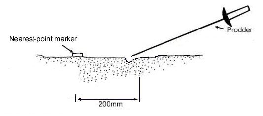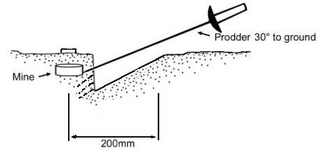 In soft ground, it may be possible to insert the prodder a considerable length into the ground. The prodded ground can then be cut away with the trowel in complete confidence that there is nothing concealed within it. The ground cut away must never be more than the ground interrogated with the prod.