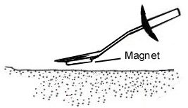 3) On uneven ground, the deminer may lightly scrape the ground surface (applying no downward pressure) with the magnet attached to the trowel. The spoil should then be tipped over the magnet to trap any ferrous fragments present.