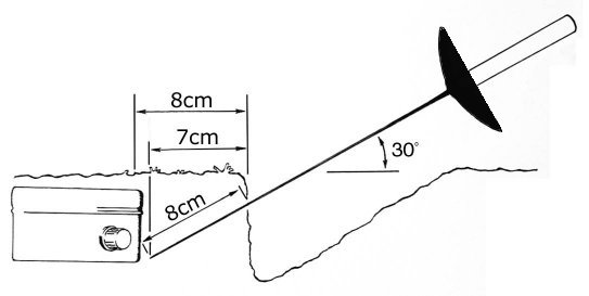 The area raked will usually extend from 20 cms beyond the metal-detector reading to the Base-stick and be the width of the Brush-rake head. When there are no other metal-detector indications in the area, it may be wider.