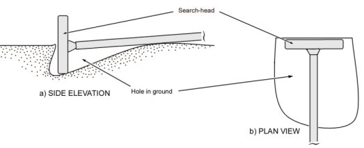 The area beneath a detector search-head that is interrogated for metal depends on the size of the metal being sought. The area can be wider than the search-head when the metal is large or near the surface, so that the detector starts to signal before the side of the search-head passes over the metal (this feature can be useful when pinpointing). As depth is increased, the area interrogated gets narrower. When a target is very small, it gets narrower very quickly. Generally, the deeper the target, the narrower the area interrogated. With a minimum-metal mine concealed at 10cm, the area beneath a detector search-head that is interrogated is never equal to the size of the search-head. This is why search-head passes have to be overlapped to ensure coverage of the entire ground to the required depth.
