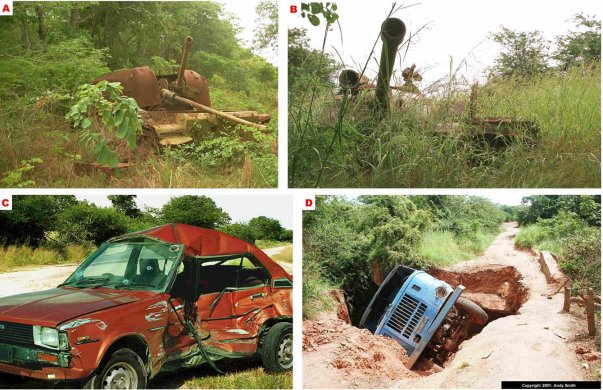 C - The picture on the lower left shows a car that has been ambushed and driven off the road. The bullet holes in the windscreen indicate that it was ambushed. The fact that it has not been burnt or blown-up is a clue that it has been booby trapped. A grenade is wedged under the driver seat with a wire from its pin to the door handle. This was done by bandits, not soldiers.