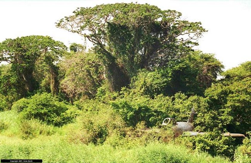 The picture shows a fighter plane at the edge of an abandoned military airstrip in the bush. The plane has no engine and most useful parts were taken before it was abandoned.