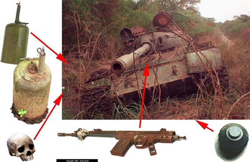 It was raining when the photograph was taken. The picture shows an abandoned tank at the side of a rural road. The undergrowth was burnt-off during the last dry season and is just starting to grow back.