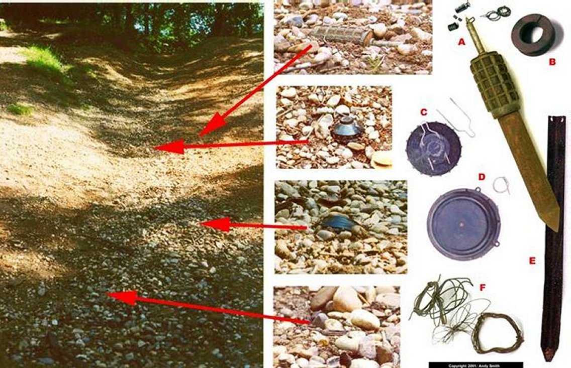 A – A POMZ-2M fragmentation mine on a wooden stake with an MUV tripwire operated fuze. Above the fuze are the parts that drop away when it is armed and several MUV arming pins that may be discarded when mines are laid.
