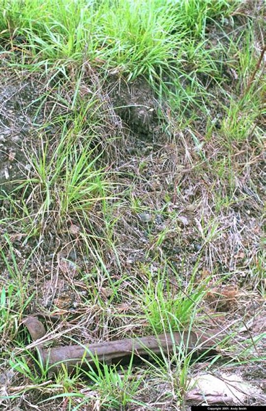 At the top of the embankment on the left is an OZM-72 bounding fragmentation mine buried to more than half of its height in the ground. This mine is usually fitted with an MUV fuze (initiator) and is tripwire activated. When the mine is activated, the inside of the mine is blown up in the air on a one meter long wire tether. When the tether is pulled tight, the main charge explodes. The main charge is surrounded by short lengths of chopped steel bar set into plastic. These metal fragments are spread over a wide area.