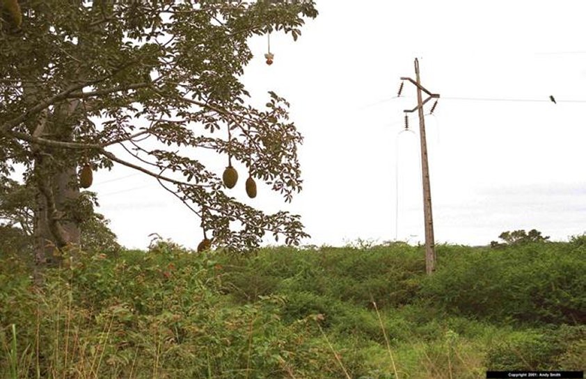 The right hand side of the picture shows that the area between the tree and the power line has also been mined. The mines used are the Gyata-64 (on the left and the PMN (on the right). Examples of the arming pins that may be discarded when these mines are placed are shown with them.