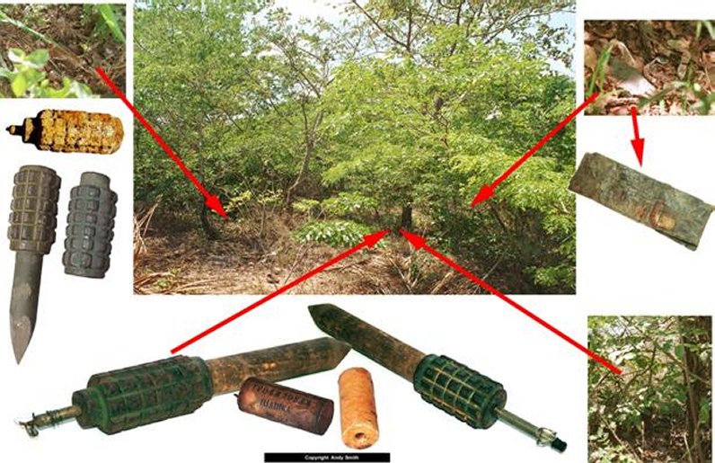 On the top left is a POMZ-2 lying on the ground. It is very corroded and its wooden stake has rotted away. The corroded mine still has a fuze attached but the pin has rusted away. A mine in this condition could explode spontaneously.