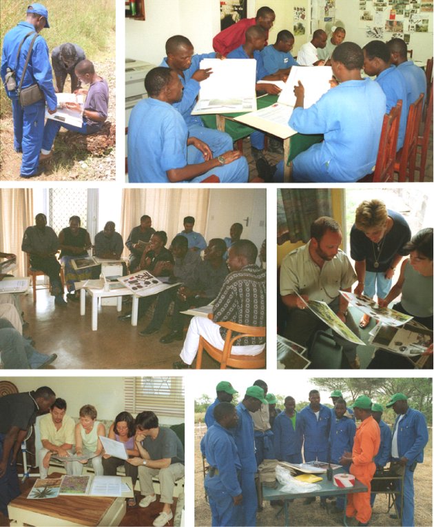 Reading clockwise from the top left the picture shows (UN)ADP surveyors using the pack for reference in Maputo Province; Handicap International’s surveyor, deminer and MRE trainers during a workshop in Inhambane Province; MineTech’s MRE staff reviewing the training resource in Harare, Zimbabwe; MgM deminers using the resource in Gaza Province; Handicap International staff holding an MRE session with overseas visitors; NPA trainers at a workshop in Tete Province.